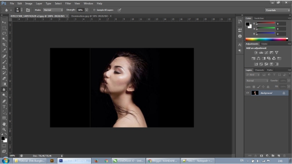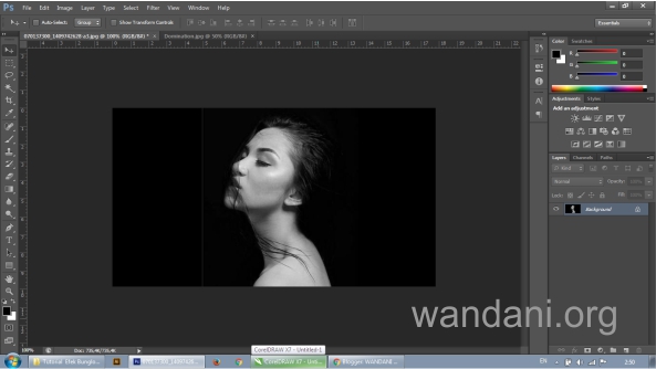 Selanjutnya anda harus satukan page halaman kerja kedua file tersebut, dengan cara DRAG photo perempuan dan tarik ke photo permandangan tersebut...